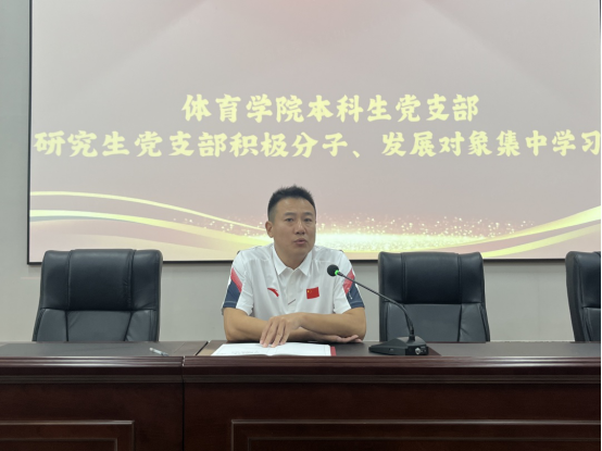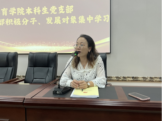 体育学院本科生党支部组织委员张静,围绕党员发展工作流程及相关材料撰写的注意事项进行了讲解。帮助入党积极分子和发展对象熟悉党员发展流程和要求。高标准、高质量,抓实、抓细、抓好党员发展工作。