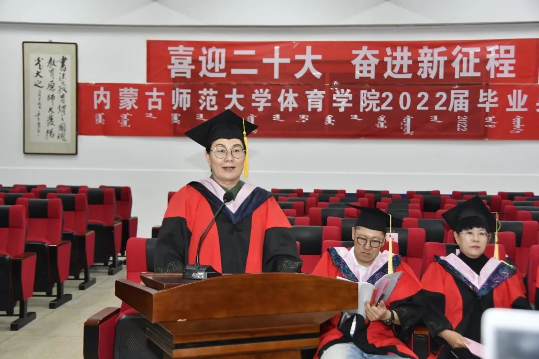 学校学术委员会委员、体育学院院长、博士生导师高娃教授对全体毕业生送上深深祝福和殷殷嘱托:“忆往昔,峥嵘岁月,几度寒暑,夏熟秋实,冬去春来。几年来,你们因体育而相聚,因体育而改变,收获了强健的体格、健康的性格和完全的人格。请同学们记住,脚下的道路有千万条,母校始终是你前行时坚强的后盾。”