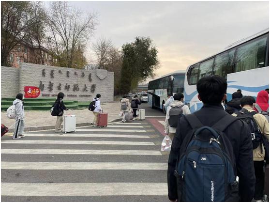 学校门口排队的老师给我们每人发了一张印有我们内蒙古师范大学校徽的贴纸,让我们每个人都贴上,然后清点人数排队准备上车。到要上车的时候我与我的导师挥手告别,登上了学校大巴车。